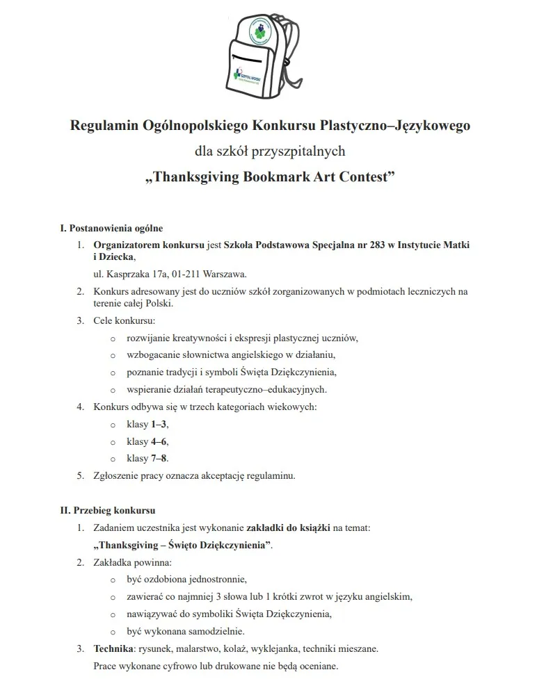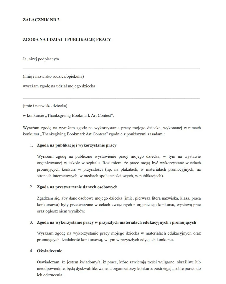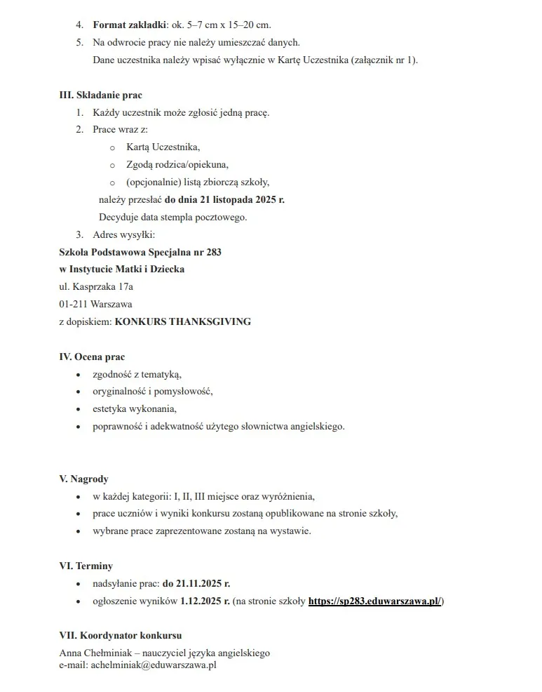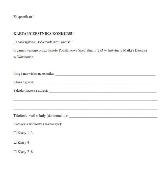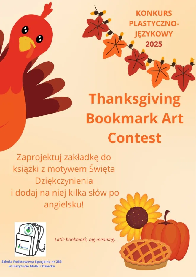 Z radością zapraszam do zachęcenia uczniów Waszej szkoły do udziału w konkursie na projekt zakładki do książki. Tematem przewodnim jest Święto Dziękczynienia, a celem jest pobudzenie twórczej wyobraźni dzieci. Będzie to świetna okazja, by połączyć naukę z zabawą i wspólnie celebrować to wyjątkowe święto.